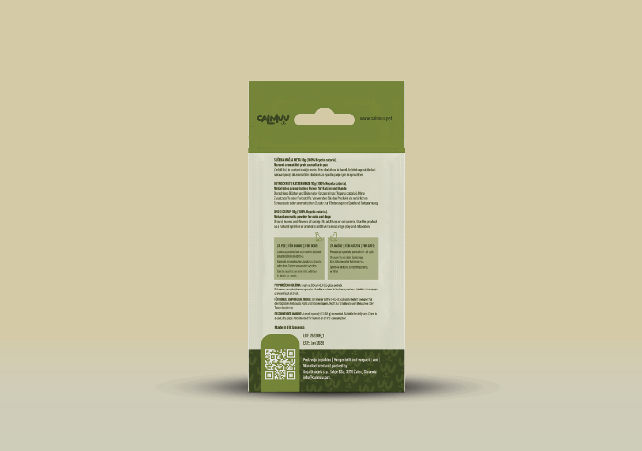 Calmuu Catnip blend je mešanica listov in cvetov premium mačje mete, brez polnil, barvil ali sintetičnih dodatkov.